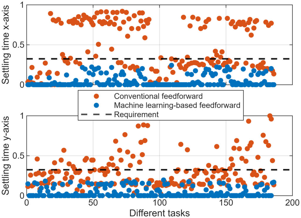 Current state-of-the-art feedforward controllers of the industrial high-tech machines are limited in performance due to hard-to-model dynamics, such as cable dynamics, frame dynamics, friction, motor driver nonlinearities, time-delays, and couplings between motion axes. The state-of-the art physics-based parametrizations of the feedforward controllers are not sufficient to capture complex dynamics of high-tech machines. This lecture addresses development of a Multiple-input, Multiple-output (MIMO) machine learning (ML)-based feedforward signal generator using Iterative Learning Control (ILC) feedforward data. This ML-based feedforward generator compensates for machine behaviors not captured by the existing feedforward control laws, while being task flexible. The innovative ML-control method is implemented on an ASMPT’s wire bonder and significantly outperforms the existing state-of-the-art physics-based feedforward strategies. Thanks to this method, maximum position errors are lowered by about 63% and the settling times are reduced by over 85%.